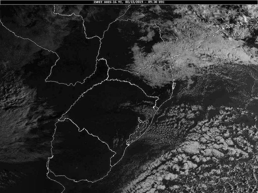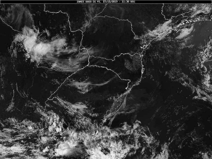 Uma massa de ar polar sobre o oceano vem influenciando o tempo nos últimos dias com calor e sem chuva. Na virada do ano uma frente fria avançará pelo estado trazendo instabilidade. Observe a imagem de satélite poucas nuvens sobre o estado.