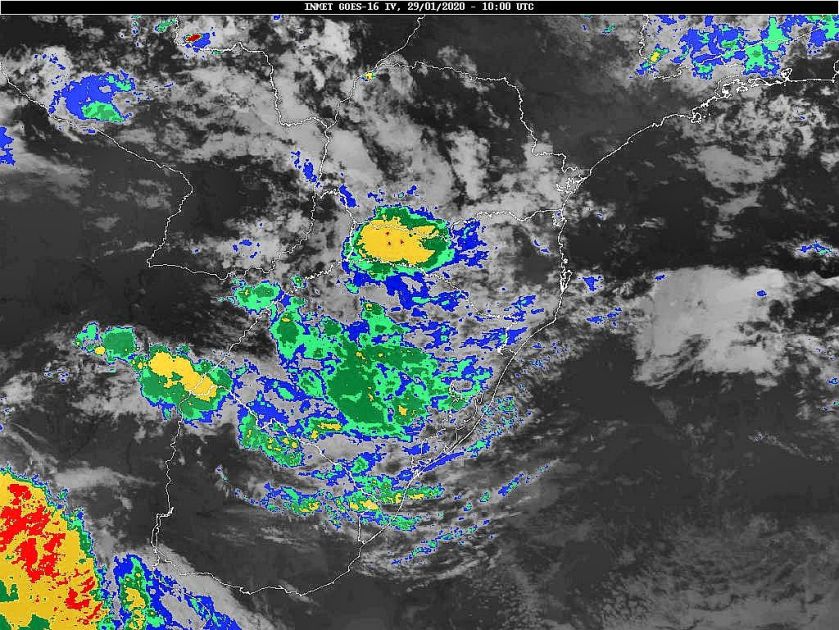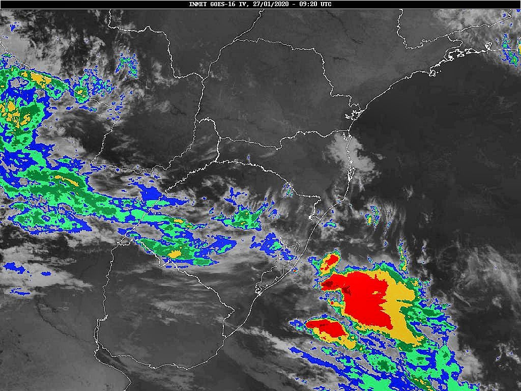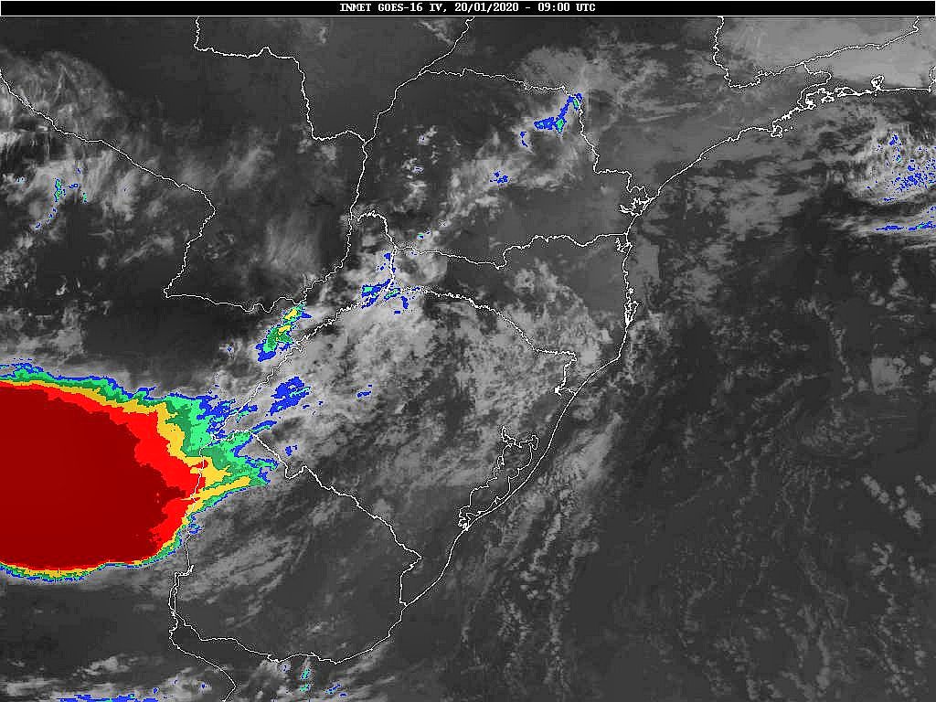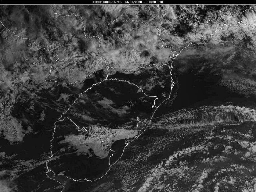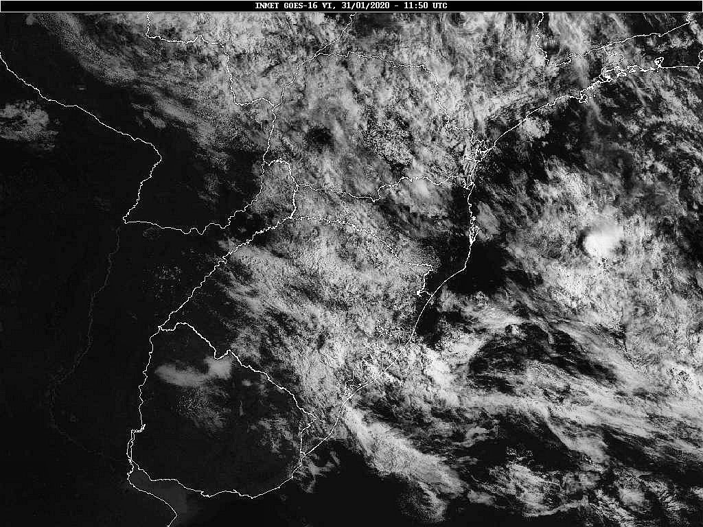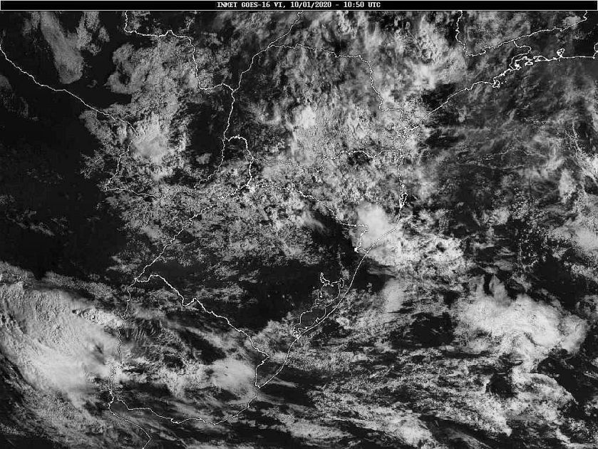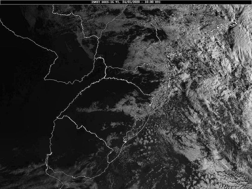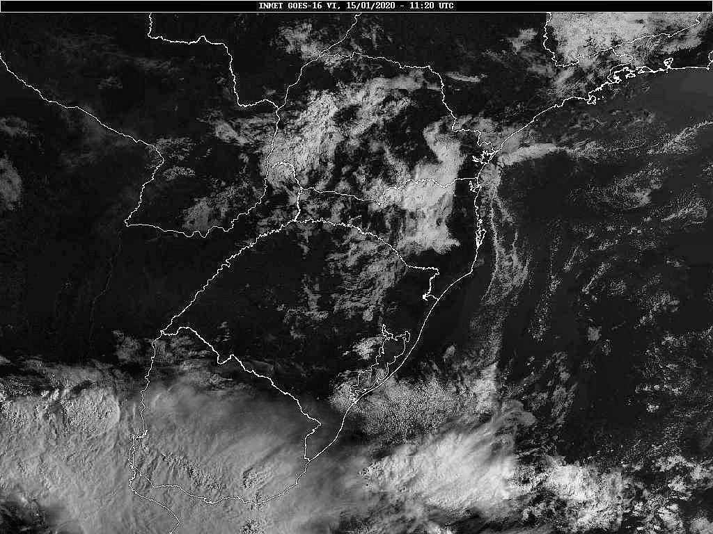 Hoje uma frente fria se desloca por nossa região. Nos próximos dias teremos um anticiclone com seu núcleo sobre o oceano facilitando a circulação marítima, e de outro lado áreas de instabilidade vindas do centro do país. Essas condições favorecem uma grande variação da nebulosidade com chuva ocasional. Observe a imagem de satélite dessa manhã nebulosidade presente entre o planalto e o oeste catarinense.