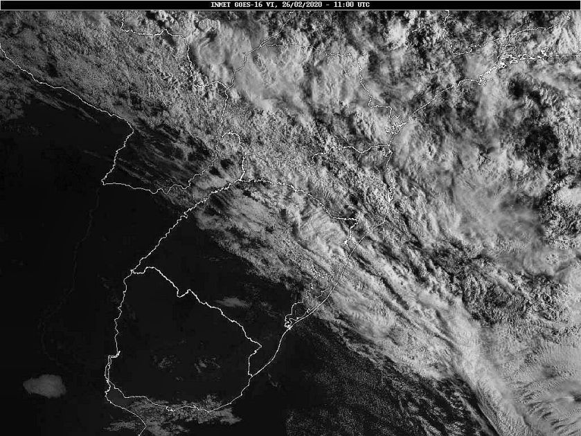 Observe a imagem de satélite desse início de manhã muitas nuvens sobre o estado devido ao deslocamento de uma frente fria. No sul do Rio Grande do Sul pouca nebulosidade pela entrada de uma massa de ar polar. Ela chegará amanhã na região trazendo temperaturas mais amenas e sol. No decorrer da sexta-feira ela se deslocará em direção ao oceano facilitando a circulação marítima e sua maior variação na cobertura de nuvens e chuva isolada.