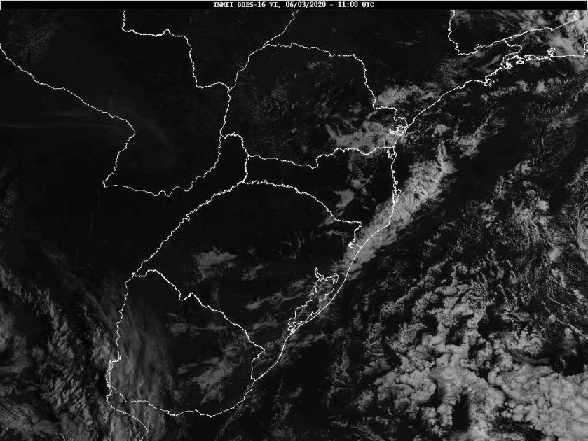 Hoje temos um sistema de baixa pressão sobre o oceano, na altura de Santa Catarina, e um anticiclone na altura da Argentina. Esses dois sistemas atuam sobre a circulação marítima, e assim, sobre a cobertura de nuvens. O fim de semana será de bons períodos de sol. Nos momentos de maior nebulosidade, alguma chance de chuva fraca e bem isolada, geralmente na madrugada ou noite. Observe a imagem de satélite desse início de manhã nebulosidade concentrada junto ao litoral centro-sul devido a circulação marítima.