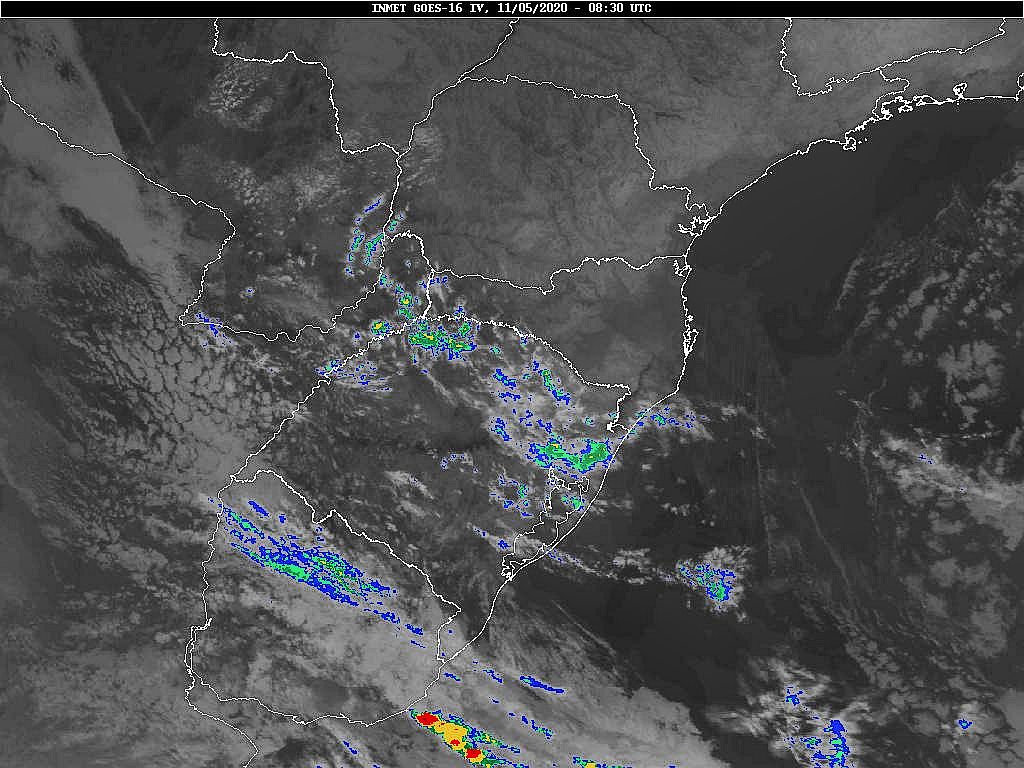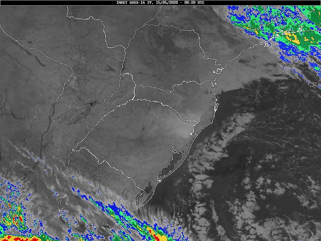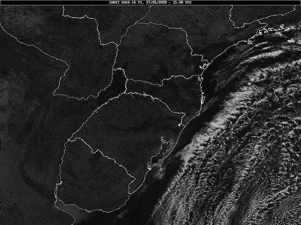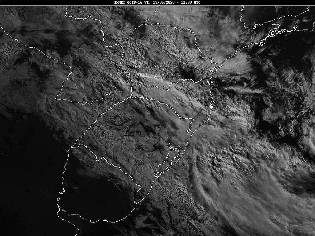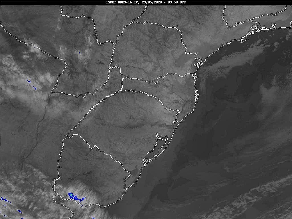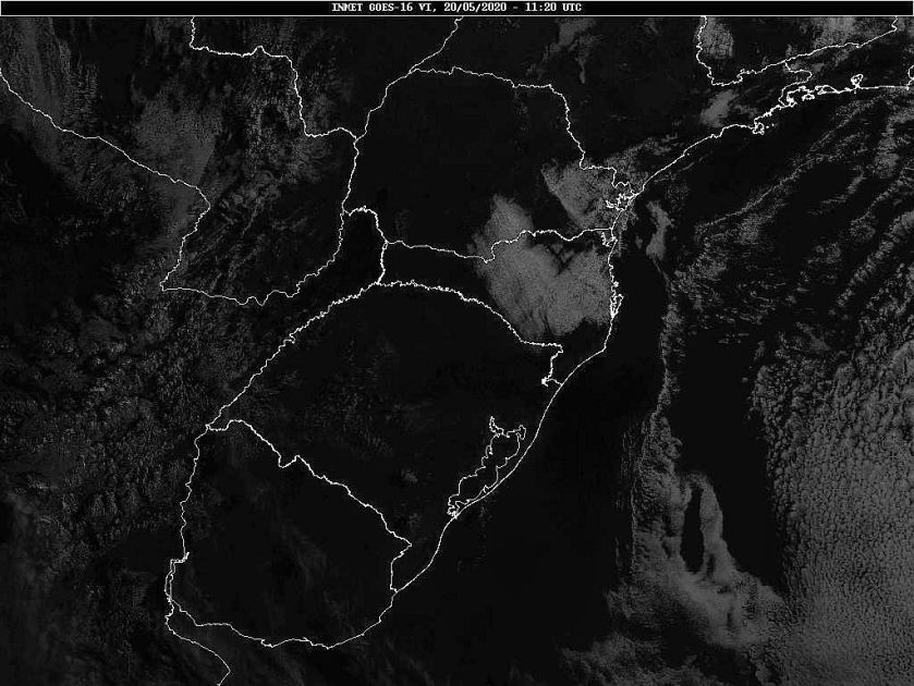 A massa de ar polar que atua sobre o estado se desloca em direção ao oceano, assim teremos mais nuvens no sábado e domingo, sem chuva. Na próxima semana duas frentes frias passarão deixando o tempo instável. Os modelos internacionais apontam chuva para segunda e terça-feira. Tomará que venha, pois maio atingirá somente 24% de chuva do que era esperado. Lembrando que chove abaixo da média desde março. Economize água. Observe a imagem de satélite pouquíssimas nuvens sobre Santa Catarina.