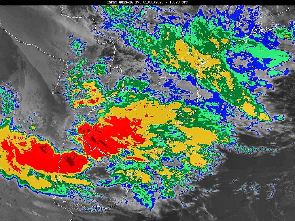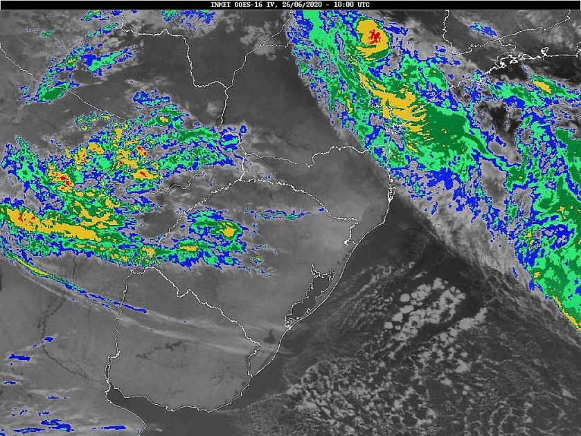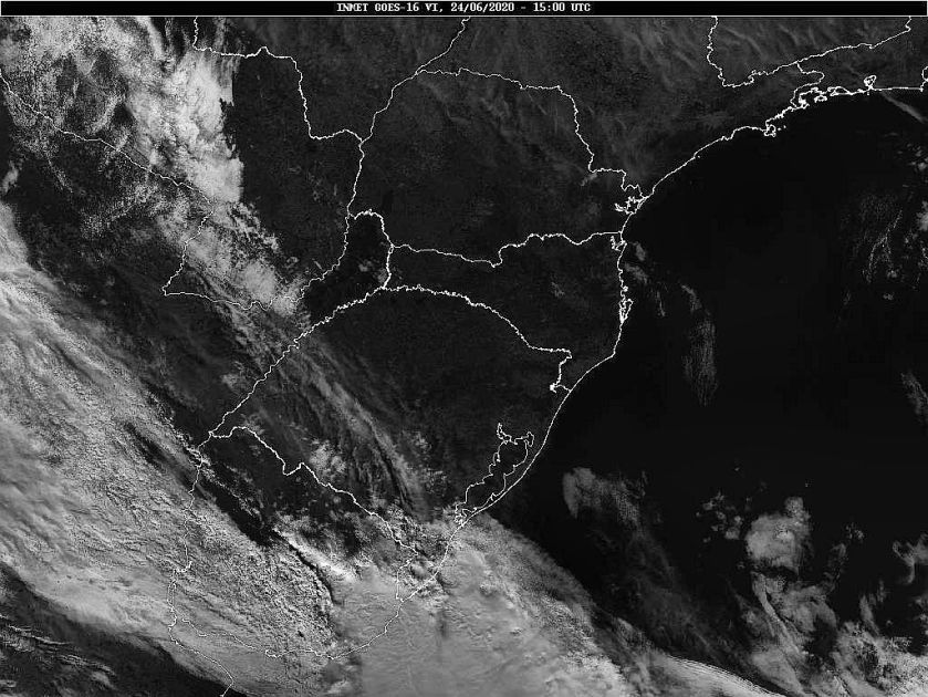 Hoje temos de um lado circulação marítima e de outro áreas de instabilidade avançando sobre o estado. Amanhã uma nova frente fria se deslocará por Santa Catarina, e no domingo outra. Assim teremos tempo instável nesse começo de semana e no domingo. Chuva mais significativa, por enquanto, somente para a próxima semana. Observe na imagem de satélite a presença de nuvens sobre o estado.
