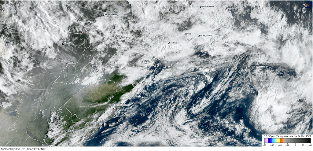 A circulação marítima dará o tom para o fim de semana e boa parte da próxima semana. Assim teremos forte variação na nebulosidade com chuva isolada para o fim de semana e ocasional para a próxima semana. Somente na quarta-feira passará uma nova frente fria. Observe a imagem de satélite nuvens concentradas sobre o litoral e parte do planalto norte.