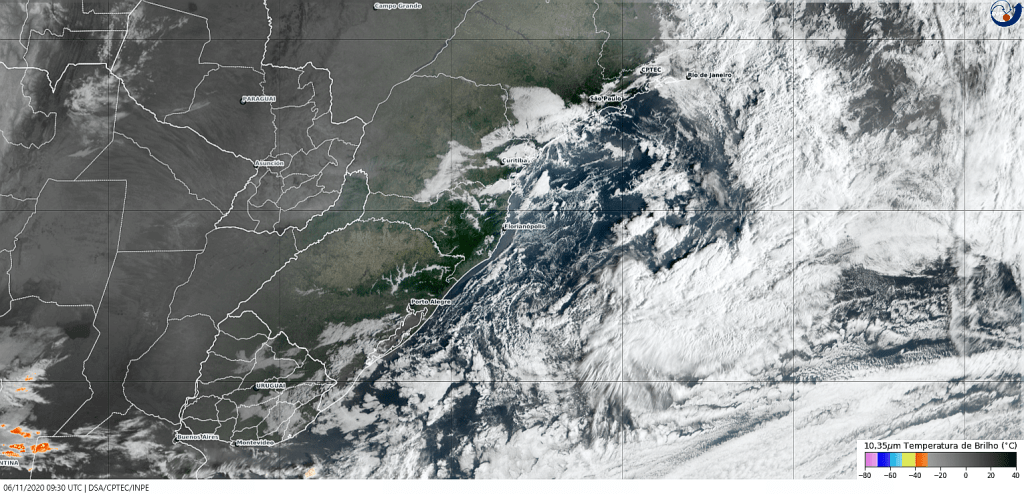Nesse final de semana teremos de um lado circulação marítima e de outro um sistema de baixa pressão sobre o oceano que se intensificará, e formará uma frente fria no sábado. No domingo áreas de instabilidade avançarão pelo estado, vindas do interior, e deixarão o tempo instável. Essas mesmas áreas se manterão sobre nossa região entre domingo à noite e quinta-feira. Chuva mais significativa com trovoada isolada para segunda e terça-feira. Observe a imagem de satélite poucas nuvens sobre Santa Catarina, mais concentradas sobre o litoral norte.