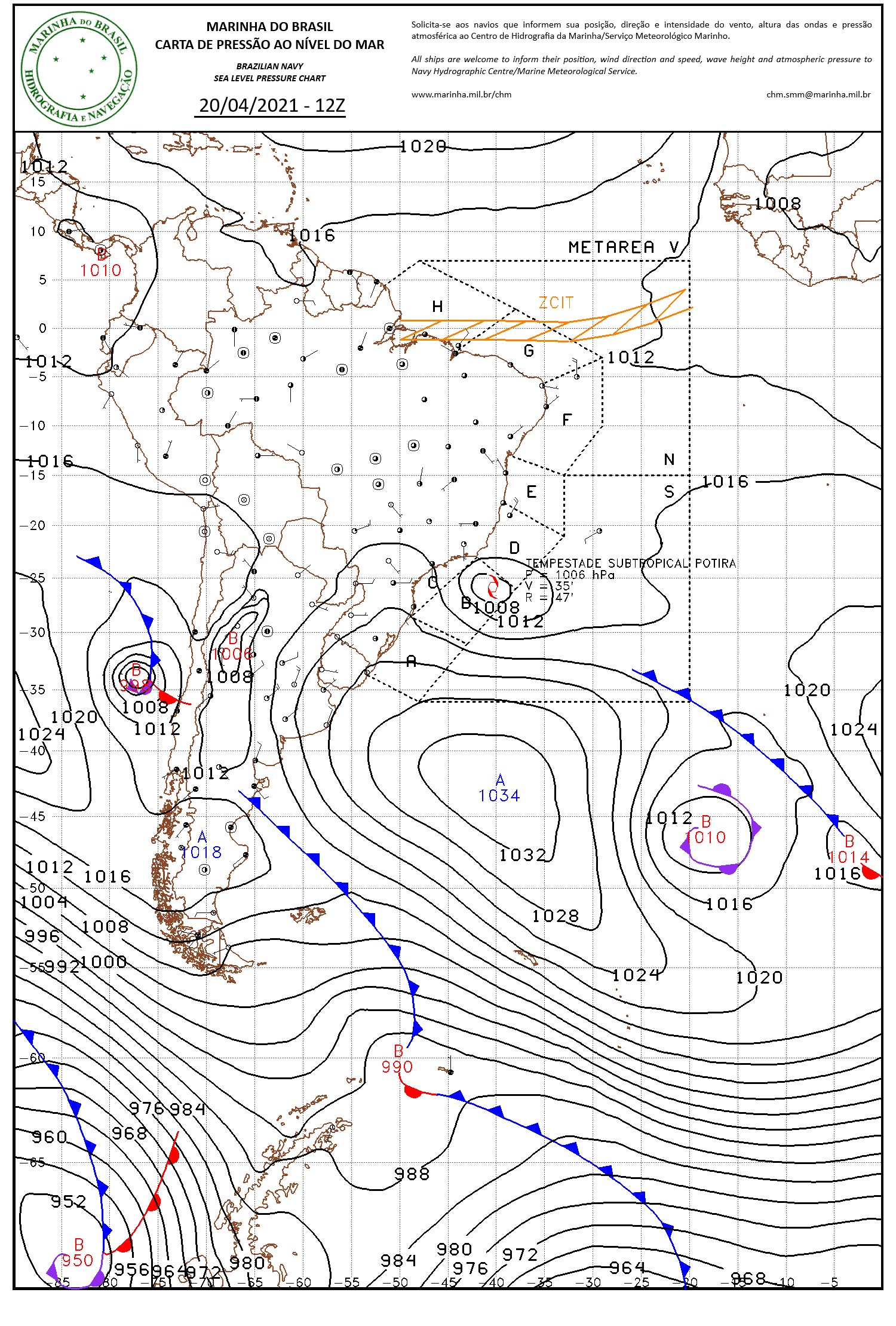 Nesta semana um sistema de baixa pressão, sobre o oceano, atua entre as regiões sudeste e sul. Classificado como depressão subtropical (figura 1), por causa da velocidade do vento, foi reclassificado pela Marinha do Brasil como “tempestade subtropical Potira” pela intensificação de seus ventos. Esse sistema está, e se movimentará vagarosamente em direção a região sul pela área oceânica da marinha de Bravo, no entorno da longitude 40° oeste. Hoje ele está na latitude de 25° sul, na sexta-feira provavelmente na latitude de 30° sul, e no domingo, com pouca força na latitude de 35° sul e na longitude de 35° oeste, na área da marinha de Sierra. Esse ciclone trará reflexos para a navegação, surfe, e condições de ressaca em nossas praias. Para essa terça-feira os modelos indicam ondas de direção sudeste entre 1,5 e 3 metros junto a costa, e entre 2,5 e 5,5 metros em alto mar. Ventos de 36 km/h (20 nós) próxima da costa, e de 58 km/h (31 nós) na área oceânica. Na quarta-feira teremos a intensificação dos ventos e da ondulação, com mar grosso a muito grosso. Ventos de até 40 km/h (22 nós) junto a costa, e de 72 km/h (39 nós) na área oceânica. As ondas ficarão entre 2,5 e 4,5 na costa, e até 6 metros fora da costa, especialmente em Bravo. Para a quinta-feira a intensidade dos ventos diminuirá entre 30 e 45 km/h (16 e 24 nós) para costa e alto mar. As ondas ficarão entre 2/4 metros na costa, e 3,5/6 metros longe da costa. Contudo, mais ao sul, no entorno das coordenadas de 30° sul e 38° oeste ventos próximos aos 100 km/h (50 nós). A partir de sexta-feira, para nosso litoral, tendência de baixa para intensidade dos ventos, como para ondulação. Com essas condições, tanto de vento como de ondas, se faz necessário a restrição para embarcações de pequeno e médio porte, bem como, cautela nas práticas desportivas em nossas praias.