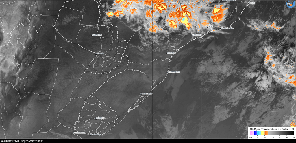 Imagem do satélite GOES 16/NOAA/EUA – Canal True-Color + IR 10,35 µm – dia – 26/09/2021 – Hora local: 20:40 – Sul do Brasil. Fonte: Instituto Nacional de Pesquisas Espaciais (INPE)/Centro de Previsão de Tempo e Estudos Climáticos (CPTEC)/Divisão de Satélites e Sistemas Ambientais (DAS) modificado por LabClima/UNIVALI. Clique para ampliar.