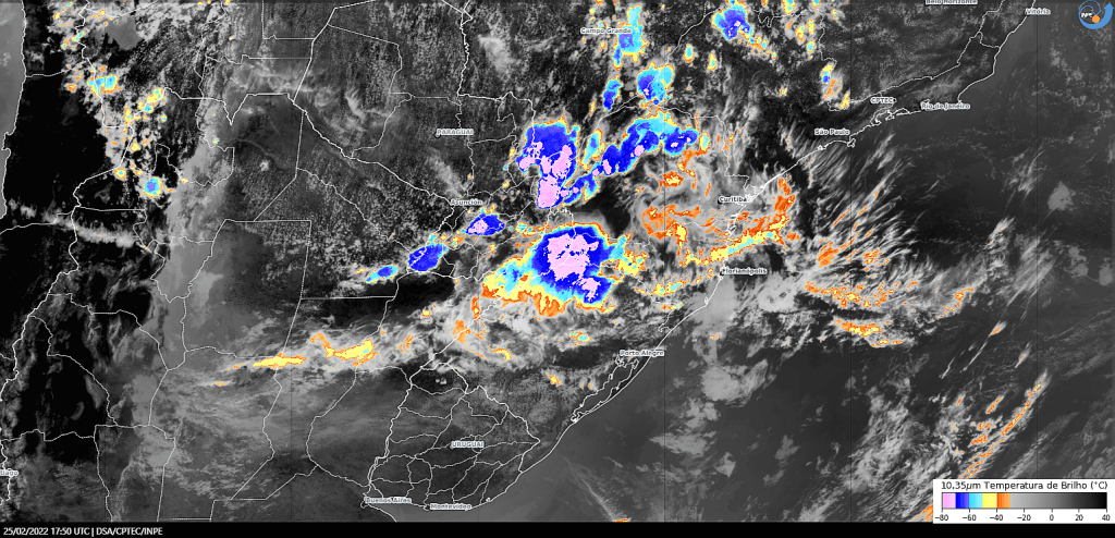 Imagem do satélite GOES 16/NOAA/EUA – Canal 13 IR 10,35 µm (DSA) – dia – 25/02/2022 – Hora local: 14:50 – Sul do Brasil. Fonte: Instituto Nacional de Pesquisas Espaciais (INPE)/Centro de Previsão de Tempo e Estudos Climáticos (CPTEC)/Divisão de Satélites e Sistemas Ambientais (DAS) modificado por LabClima/UNIVALI. Clique para ampliar.