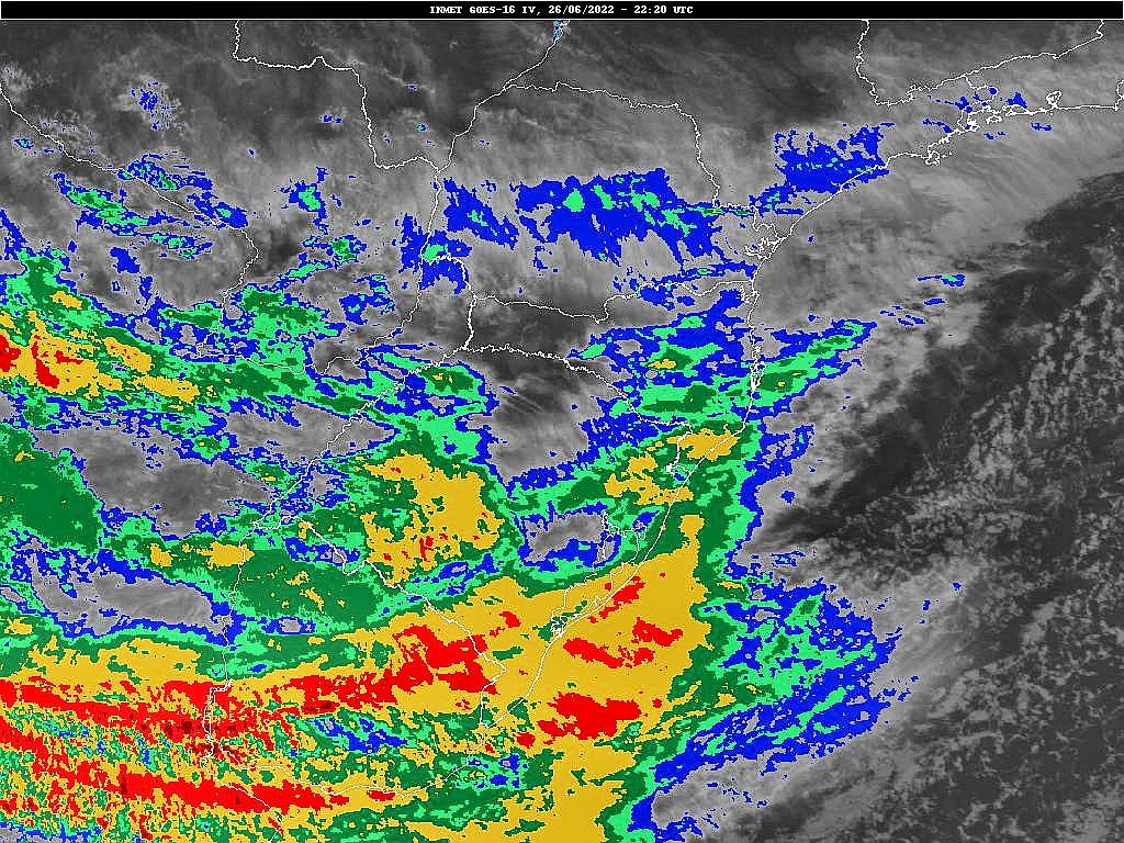 Imagem do satélite GOES 16/NOAA/EUA – Canal do Infravermelho + realce (topo das nuvens em °C) – dia -26/06/2022 – Hora local: 19:20 – Sul do Brasil. Fonte: Instituto Nacional de Meteorologia (INMET) modificado por LabClima/UNIVALI.