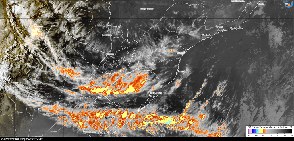 Imagem do satélite GOES 16/NOAA/EUA – Canal True-Color + IR 10,35 µm – dia – 21/07/2022 – Hora local: 18:00 – Sul do Brasil. Fonte: Instituto Nacional de Pesquisas Espaciais (INPE)/Centro de Previsão de Tempo e Estudos Climáticos (CPTEC)/Divisão de Satélites e Sistemas Ambientais (DAS) modificado por LabClima/UNIVALI. Clique para ampliar.