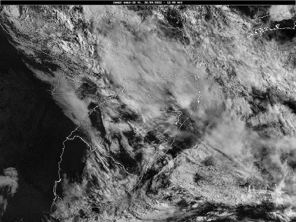 Imagem do satélite GOES 16/NOAA/EUA – Canal do Infravermelho + realce (topo das nuvens em °C) – dia -26/09/2022 – Hora local: 09:00 – Sul do Brasil. Fonte: Instituto Nacional de Meteorologia (INMET) modificado por LabClima/UNIVALI.