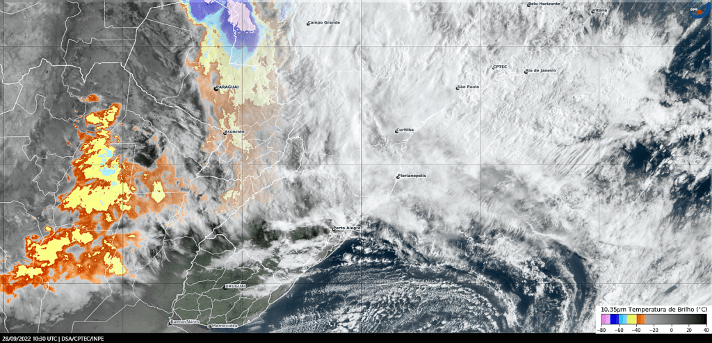 Imagem do satélite GOES 16/NOAA/EUA – Canal True-Color + IR 10,35 µm – dia – 28/09/2022 – Hora local: 07:30 – Sul do Brasil. Fonte: Instituto Nacional de Pesquisas Espaciais (INPE)/Centro de Previsão de Tempo e Estudos Climáticos (CPTEC)/Divisão de Satélites e Sistemas Ambientais (DAS) modificado por LabClima/UNIVALI. Clique para ampliar.