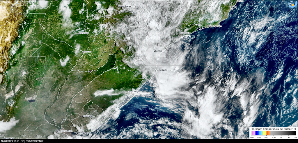 Imagem do satélite GOES 16/NOAA/EUA – Canal True-Color + IR 10,35 µm – dia – 10/03/2023 – Hora local: 09:10 – Sul do Brasil. Fonte: Instituto Nacional de Pesquisas Espaciais (INPE)/Centro de Previsão de Tempo e Estudos Climáticos (CPTEC)/Divisão de Satélites e Sistemas Ambientais (DAS) modificado por LabClima/UNIVALI. Clique para ampliar.