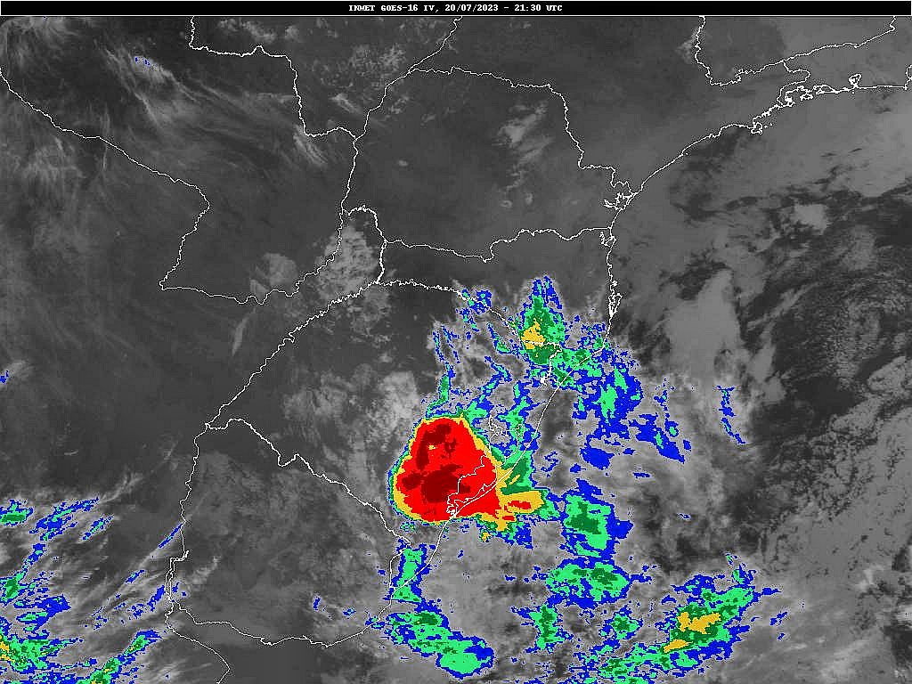 Imagem do satélite GOES 16/NOAA/EUA – Canal True-Color + IR 10,35 µm – dia – 30/07/2023 – Hora local: 20:30 – Sul do Brasil. Fonte: Instituto Nacional de Pesquisas Espaciais (INPE)/Centro de Previsão de Tempo e Estudos Climáticos (CPTEC)/Divisão de Satélites e Sistemas Ambientais (DAS) modificado por LabClima/UNIVALI. Clique para ampliar.