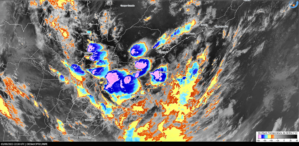 Imagem do satélite GOES 16/NOAA/EUA – Canal True-Color + IR 10,35 µm – dia – 03/09/2023 – Hora local: 19:30 – Sul do Brasil. Fonte: Instituto Nacional de Pesquisas Espaciais (INPE)/Centro de Previsão de Tempo e Estudos Climáticos (CPTEC)/Divisão de Satélites e Sistemas Ambientais (DAS) modificado por LabClima/UNIVALI. Clique para ampliar.