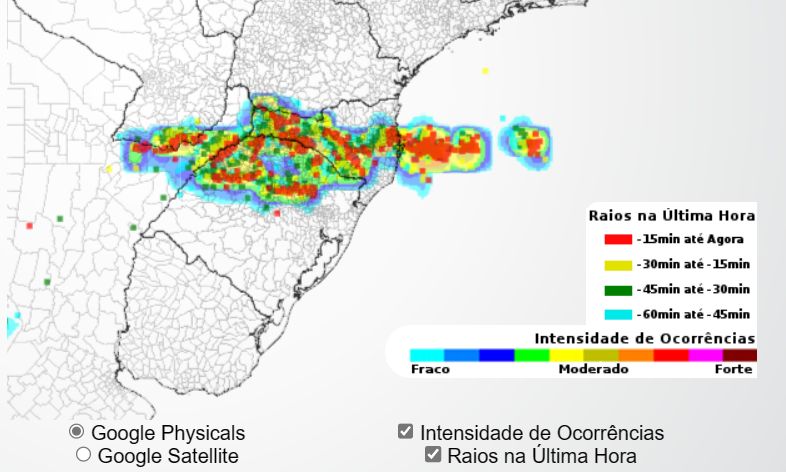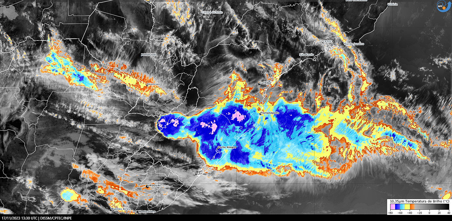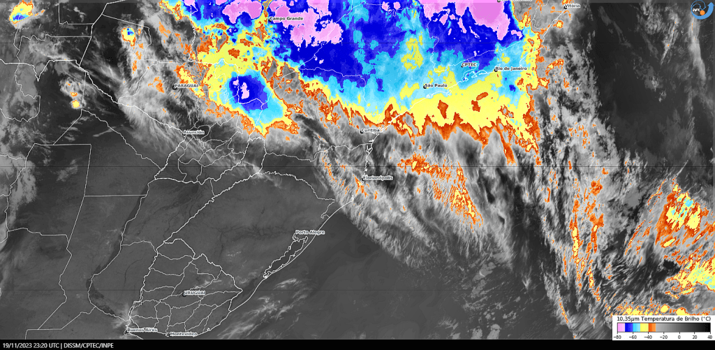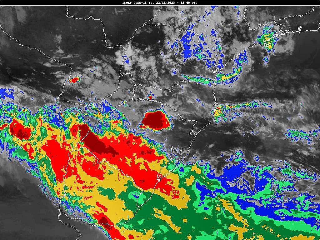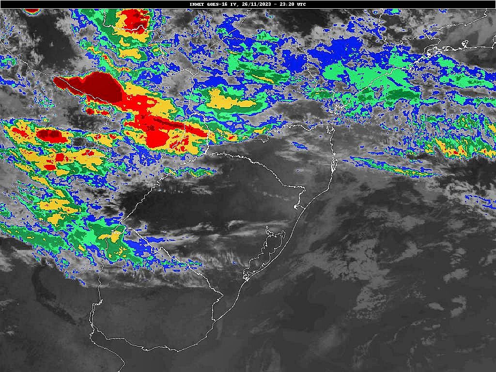 Imagem do satélite GOES 16/NOAA/EUA – Canal True-Color + IR 10,35 µm – dia – 29/11/2023 – Hora local: 08:20 – Sul do Brasil. Fonte: Instituto Nacional de Pesquisas Espaciais (INPE)/Centro de Previsão de Tempo e Estudos Climáticos (CPTEC)/Divisão de Satélites e Sistemas Ambientais (DAS) modificado por LabClima/UNIVALI. Clique para ampliar.