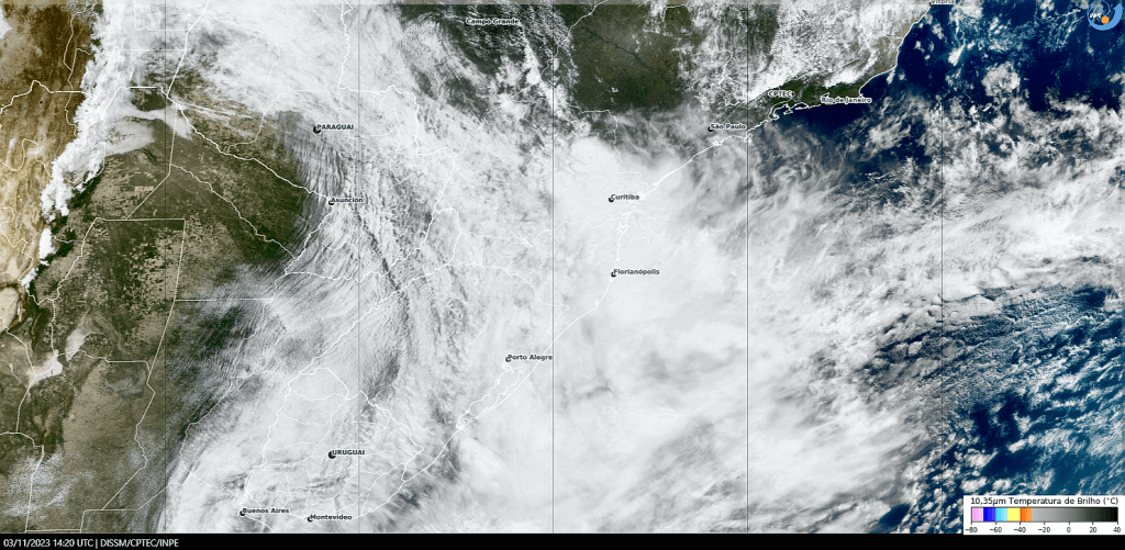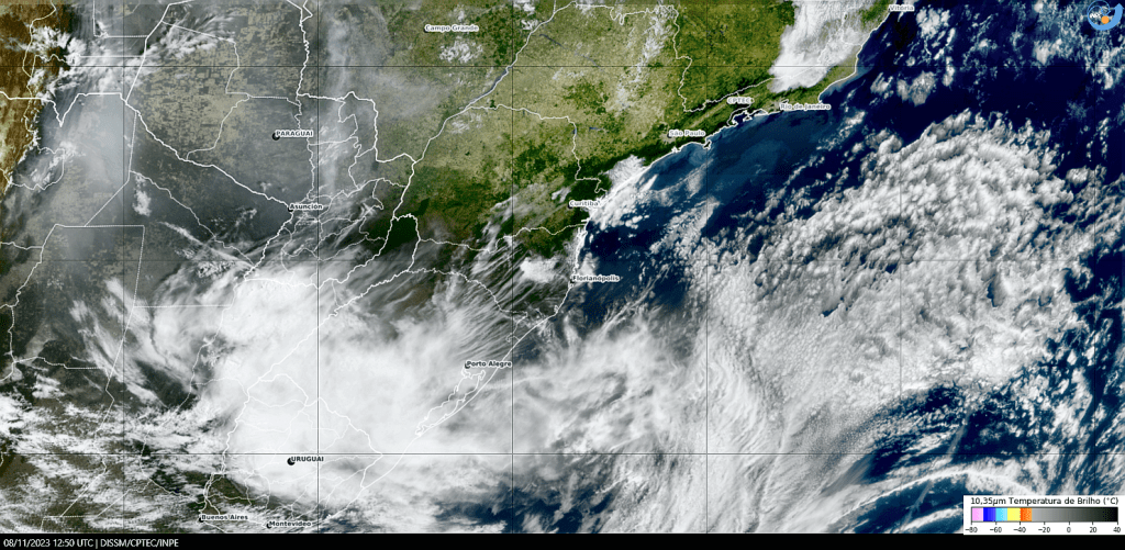 Imagem do satélite GOES 16/NOAA/EUA – Canal True-Color + IR 10,35 µm – dia – 08/11/2023 – Hora local: 09:50 – Sul do Brasil. Fonte: Instituto Nacional de Pesquisas Espaciais (INPE)/Centro de Previsão de Tempo e Estudos Climáticos (CPTEC)/Divisão de Satélites e Sistemas Ambientais (DAS) modificado por LabClima/UNIVALI. Clique para ampliar.