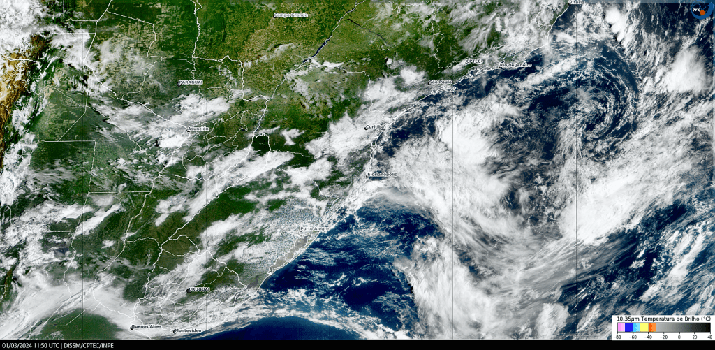 Imagem do satélite GOES 16/NOAA/EUA – Canal True-Color + IR 10,35 µm – dia – 07/03/2024 – Hora local: 08:00 – Sul do Brasil. Fonte: Instituto Nacional de Pesquisas Espaciais (INPE)/Centro de Previsão de Tempo e Estudos Climáticos (CPTEC)/Divisão de Satélites e Sistemas Ambientais (DAS) modificado por LabClima/UNIVALI. Clique para ampliar.