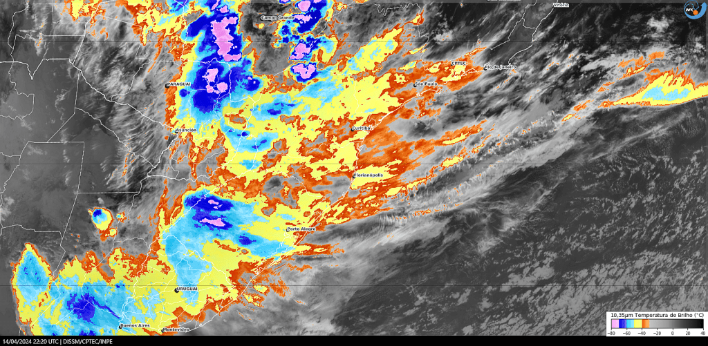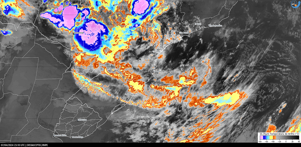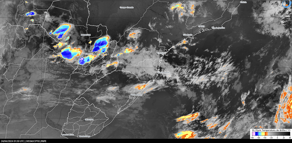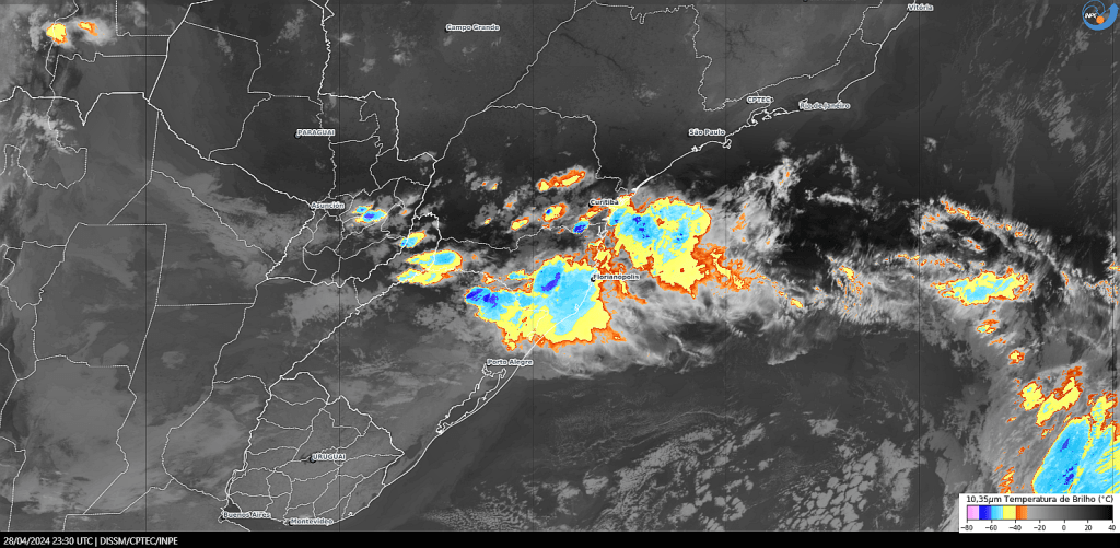 Imagem do satélite GOES 16/NOAA/EUA – Canal True-Color + IR 10,35 µm – dia – 28/04/2024 – Hora local: 20:30 – Sul do Brasil. Fonte: Instituto Nacional de Pesquisas Espaciais (INPE)/Centro de Previsão de Tempo e Estudos Climáticos (CPTEC)/Divisão de Satélites e Sistemas Ambientais (DAS) modificado por LabClima/UNIVALI. Clique para ampliar.