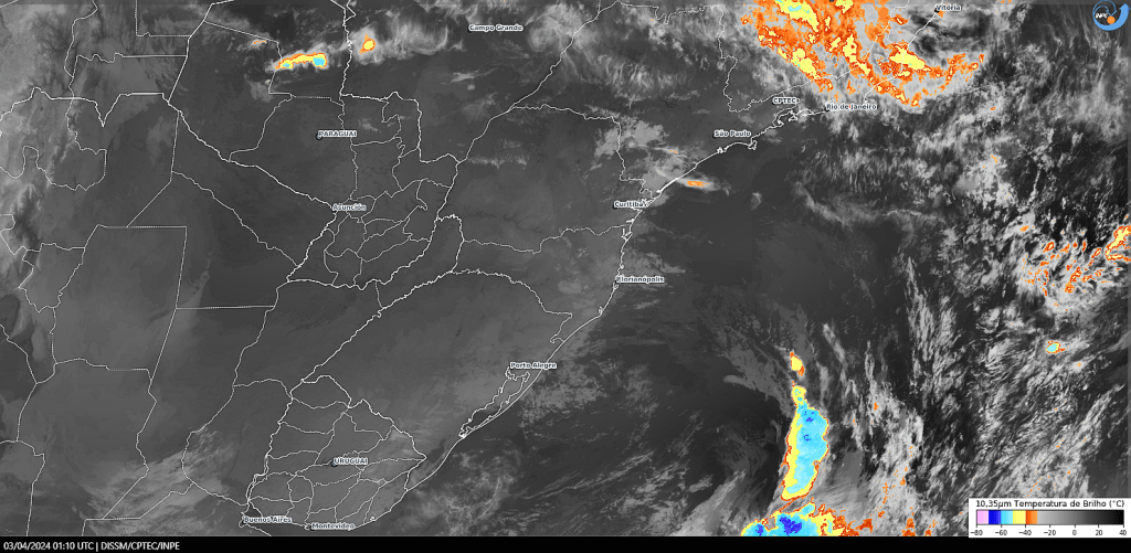 Imagem do satélite GOES 16/NOAA/EUA – Canal True-Color + IR 10,35 µm – dia – 02/04/2024 – Hora local: 22:10 – Sul do Brasil. Fonte: Instituto Nacional de Pesquisas Espaciais (INPE)/Centro de Previsão de Tempo e Estudos Climáticos (CPTEC)/Divisão de Satélites e Sistemas Ambientais (DAS) modificado por LabClima/UNIVALI. Clique para ampliar.