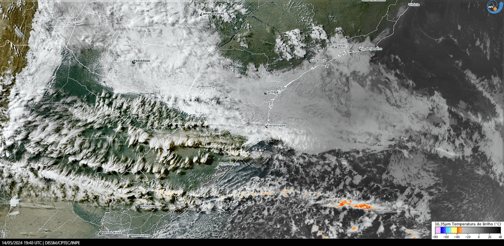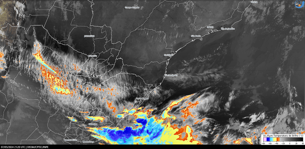Imagem do satélite GOES 16/NOAA/EUA – Canal True-Color + IR 10,35 µm – dia – 30/05/2024 – Hora local: 20:20 – Sul do Brasil. Fonte: Instituto Nacional de Pesquisas Espaciais (INPE)/Centro de Previsão de Tempo e Estudos Climáticos (CPTEC)/Divisão de Satélites e Sistemas Ambientais (DAS) modificado por LabClima/UNIVALI. Clique para ampliar.
