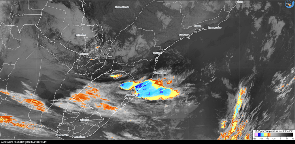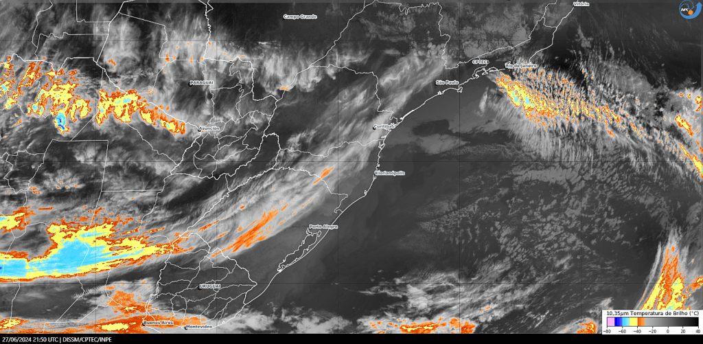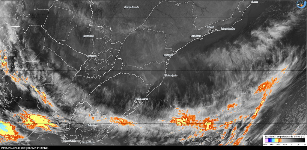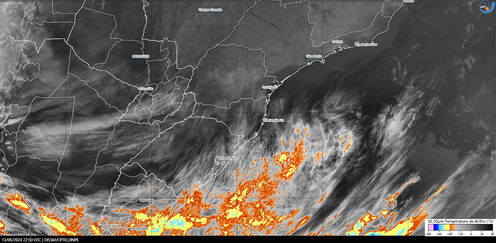 Imagem do satélite GOES 16/NOAA/EUA – Canal True-Color + IR 10,35 µm – dia – 01/07/2024 – Hora local: 06:50 – Sul do Brasil. Fonte: Instituto Nacional de Pesquisas Espaciais (INPE)/Centro de Previsão de Tempo e Estudos Climáticos (CPTEC)/Divisão de Satélites e Sistemas Ambientais (DAS) modificado por LabClima/UNIVALI. Clique para ampliar.