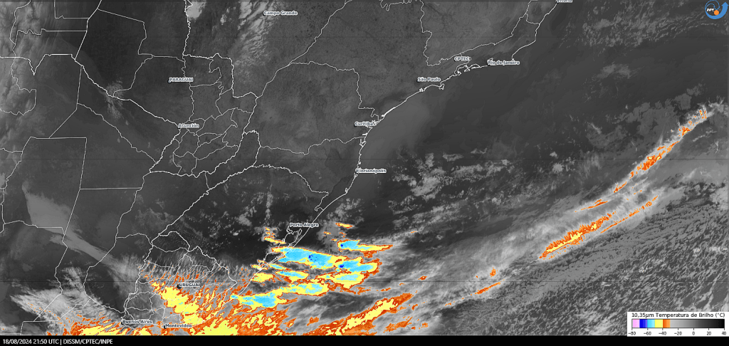 Imagem do satélite GOES 16/NOAA/EUA – Canal True-Color + IR 10,35 µm – dia – 18/08/2024 – Hora local: 18:50 – Sul do Brasil. Fonte: Instituto Nacional de Pesquisas Espaciais (INPE)/Centro de Previsão de Tempo e Estudos Climáticos (CPTEC)/Divisão de Satélites e Sistemas Ambientais (DAS) modificado por LabClima/UNIVALI. Clique para ampliar.
