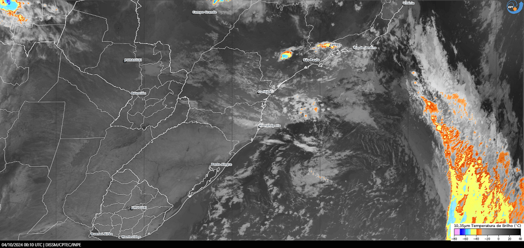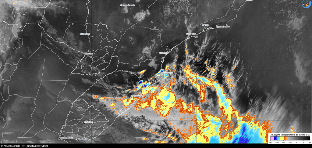 Imagem do satélite GOES 16/NOAA/EUA – Canal True-Color + IR 10,35 µm – dia – 08/10/2024 – Hora local: 19:40 – Sul do Brasil. Fonte: Instituto Nacional de Pesquisas Espaciais (INPE)/Centro de Previsão de Tempo e Estudos Climáticos (CPTEC)/Divisão de Satélites e Sistemas Ambientais (DAS) modificado por LabClima/UNIVALI. Clique para ampliar.