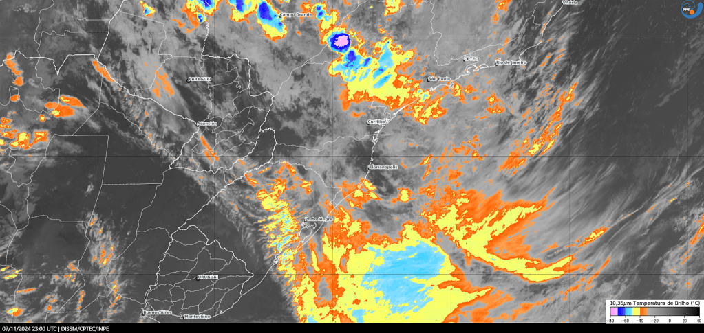Imagem do satélite GOES 16/NOAA/EUA – Canal True-Color + IR 10,35 µm – dia – 07/11/2024 – Hora local: 20:00 – Sul do Brasil. Fonte: Instituto Nacional de Pesquisas Espaciais (INPE)/Centro de Previsão de Tempo e Estudos Climáticos (CPTEC)/Divisão de Satélites e Sistemas Ambientais (DAS) modificado por LabClima/UNIVALI. Clique para ampliar.