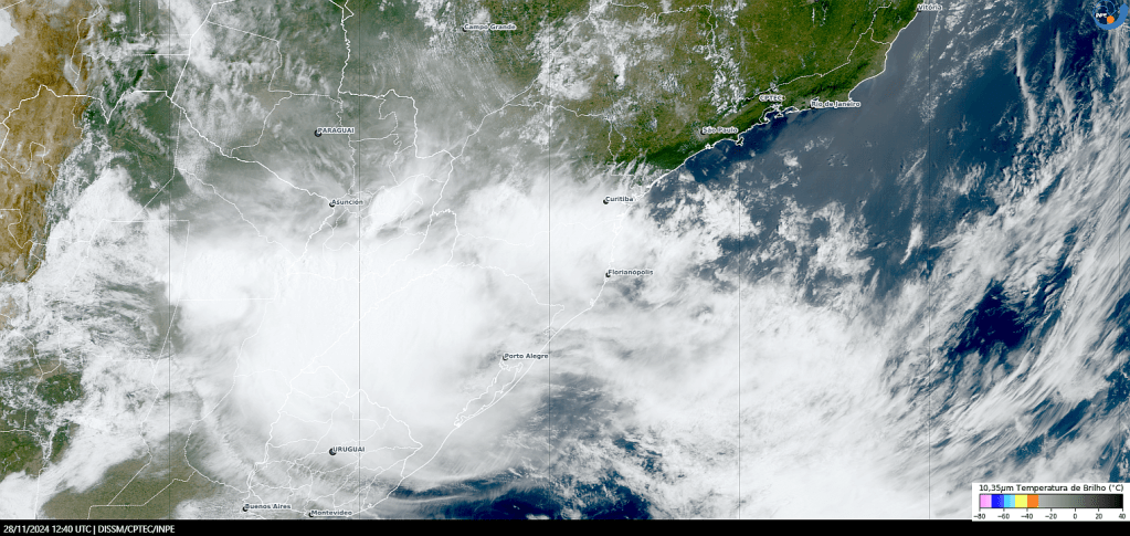 Imagem do satélite GOES 16/NOAA/EUA – Canal True-Color + IR 10,35 µm – dia – 28/11/2024 – Hora local: 09:40 – Sul do Brasil. Fonte: Instituto Nacional de Pesquisas Espaciais (INPE)/Centro de Previsão de Tempo e Estudos Climáticos (CPTEC)/Divisão de Satélites e Sistemas Ambientais (DAS) modificado por LabClima/UNIVALI. Clique para ampliar.