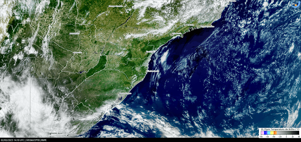 Imagem do satélite GOES 16/NOAA/EUA – Canal True-Color + IR 10,35 µm – dia – 02/03/2025 – Hora local: 11:10 – Sul do Brasil. Fonte: Instituto Nacional de Pesquisas Espaciais (INPE)/Centro de Previsão de Tempo e Estudos Climáticos (CPTEC)/Divisão de Satélites e Sistemas Ambientais (DAS) modificado por LabClima/UNIVALI. Clique para ampliar.