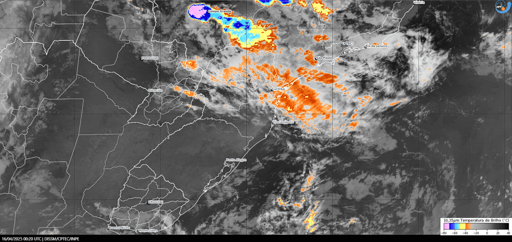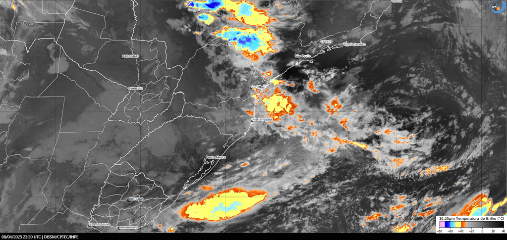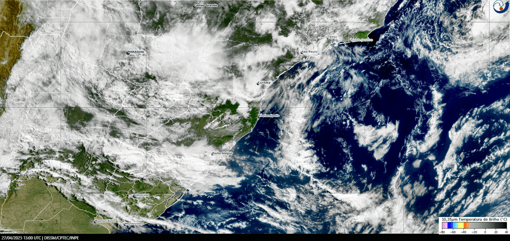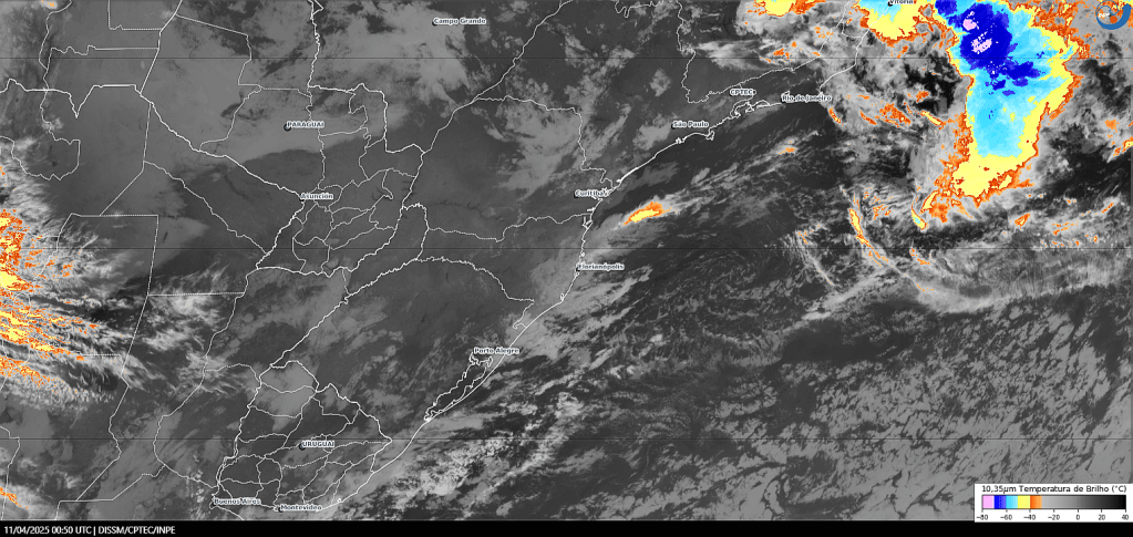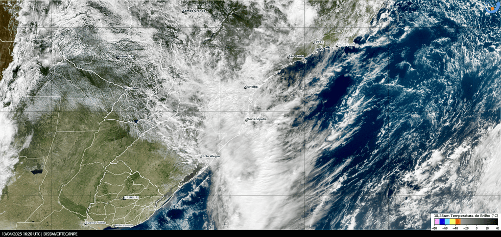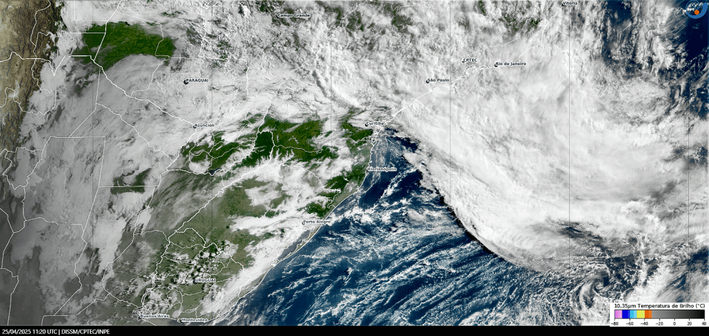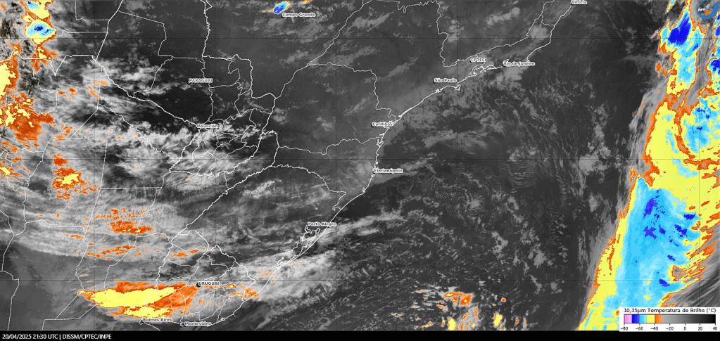 Imagem do satélite GOES 16/NOAA/EUA – Canal True-Color + IR 10,35 µm – dia – 29/04/2025 – Hora local: 20:40 – Sul do Brasil. Fonte: Instituto Nacional de Pesquisas Espaciais (INPE)/Centro de Previsão de Tempo e Estudos Climáticos (CPTEC)/Divisão de Satélites e Sistemas Ambientais (DAS) modificado por LabClima/UNIVALI. Clique para ampliar.