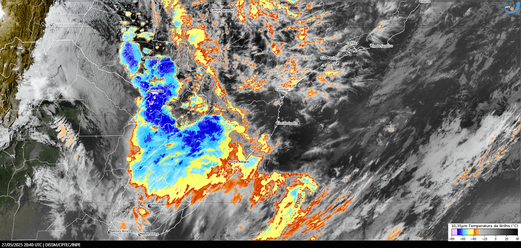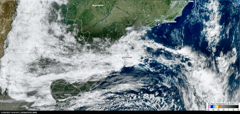 Imagem do satélite GOES 16/NOAA/EUA – Canal True-Color + IR 10,35 µm – dia – 29/05/2025 – Hora local: 11:40 – Sul do Brasil. Fonte: Instituto Nacional de Pesquisas Espaciais (INPE)/Centro de Previsão de Tempo e Estudos Climáticos (CPTEC)/Divisão de Satélites e Sistemas Ambientais (DAS) modificado por LabClima/UNIVALI. Clique para ampliar.