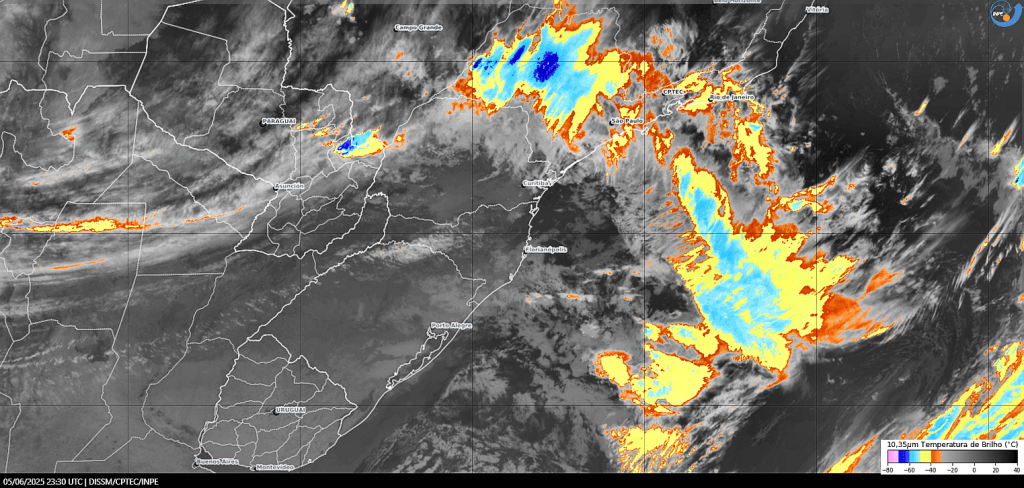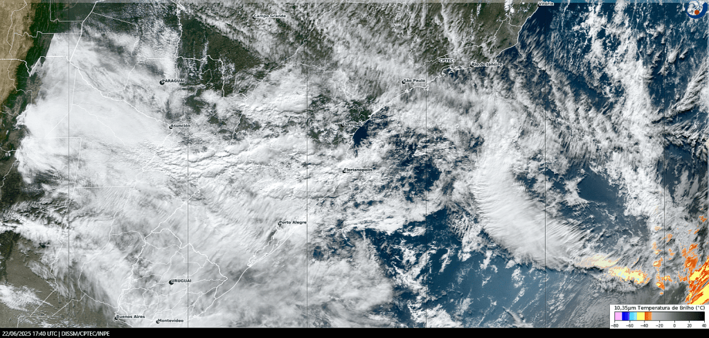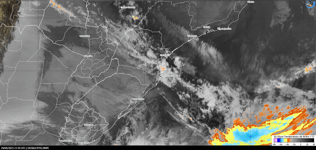Imagem do satélite GOES 16/NOAA/EUA – Canal True-Color + IR 10,35 µm – dia – 29/06/2025 – Hora local: 18:10 – Sul do Brasil. Fonte: Instituto Nacional de Pesquisas Espaciais (INPE)/Centro de Previsão de Tempo e Estudos Climáticos (CPTEC)/Divisão de Satélites e Sistemas Ambientais (DAS) modificado por LabClima/UNIVALI. Clique para ampliar.
