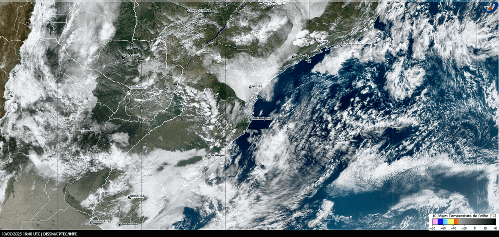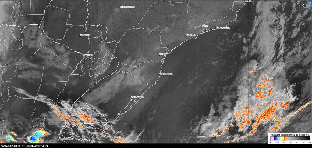 Imagem do satélite GOES 16/NOAA/EUA – Canal True-Color + IR 10,35 µm – dia – 31/07/2025 – Hora local: 19:10 – Sul do Brasil. Fonte: Instituto Nacional de Pesquisas Espaciais (INPE)/Centro de Previsão de Tempo e Estudos Climáticos (CPTEC)/Divisão de Satélites e Sistemas Ambientais (DAS) modificado por LabClima/UNIVALI. Clique para ampliar.