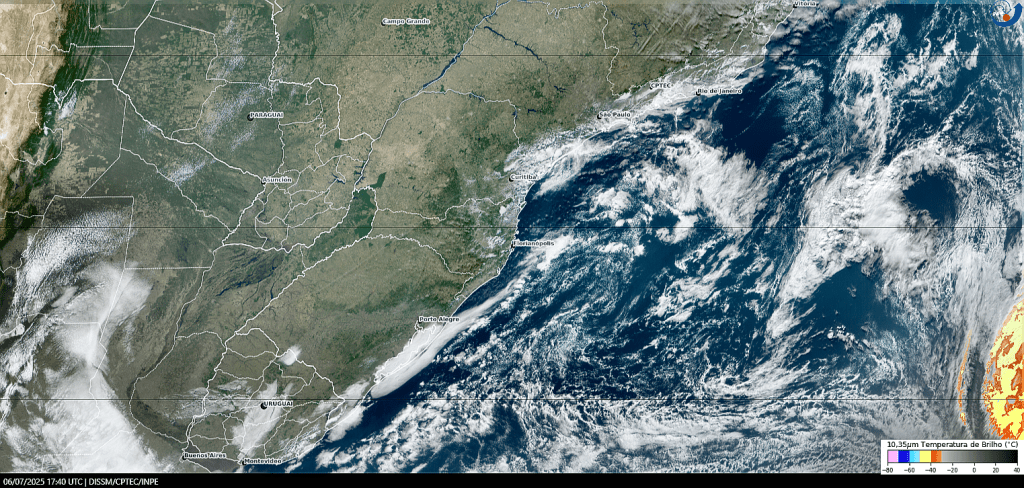 Imagem do satélite GOES 16/NOAA/EUA – Canal True-Color + IR 10,35 µm – dia – 06/07/2025 – Hora local: 14:40 – Sul do Brasil. Fonte: Instituto Nacional de Pesquisas Espaciais (INPE)/Centro de Previsão de Tempo e Estudos Climáticos (CPTEC)/Divisão de Satélites e Sistemas Ambientais (DAS) modificado por LabClima/UNIVALI. Clique para ampliar.