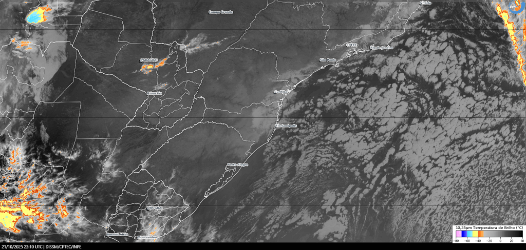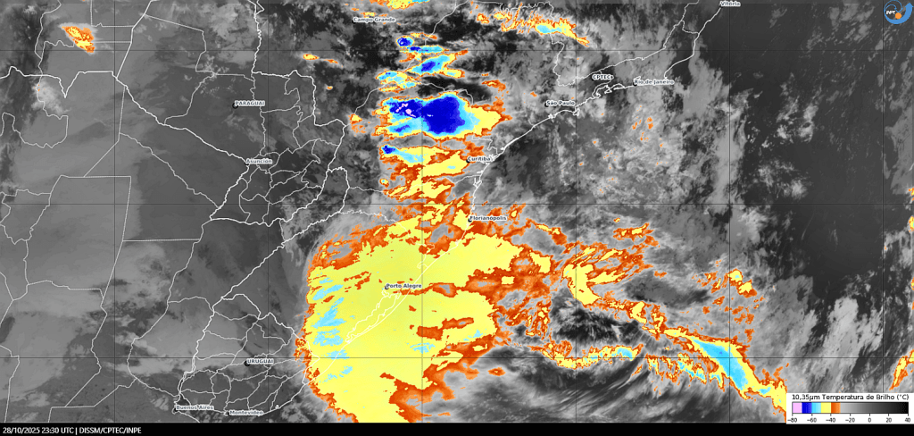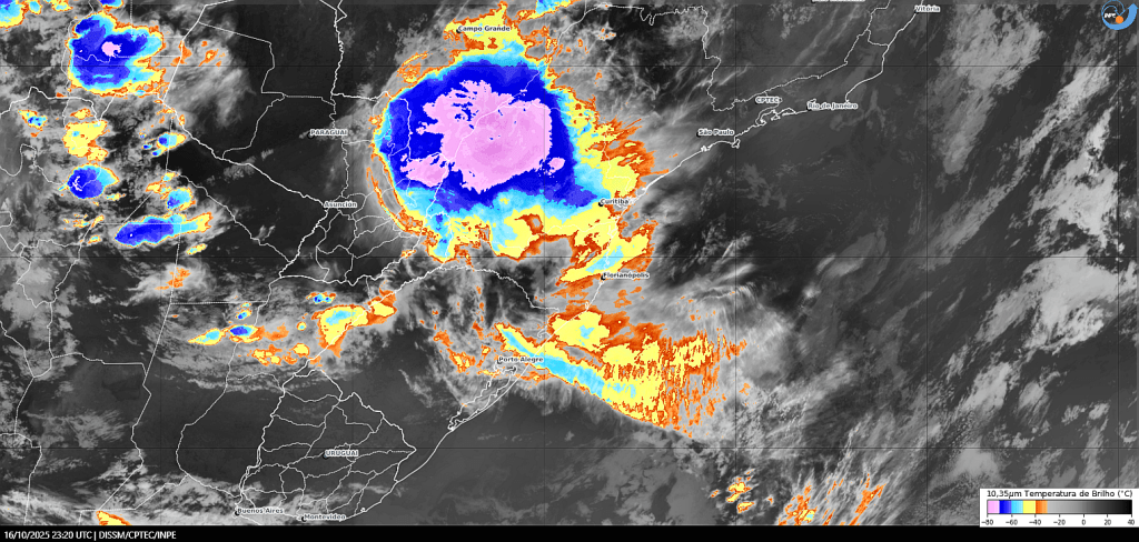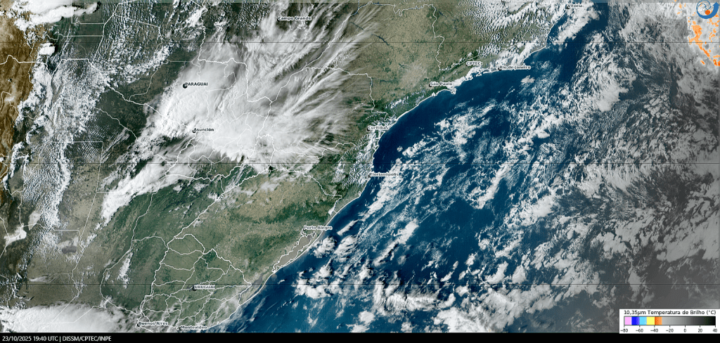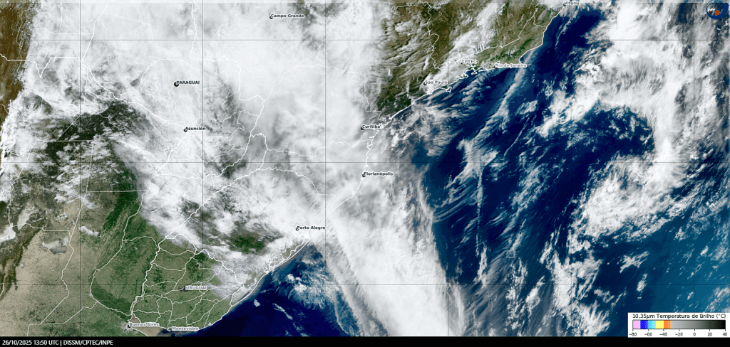 Imagem do satélite GOES 16/NOAA/EUA – Canal True-Color + IR 10,35 µm – dia – 30/10/2025 – Hora local: 16:10 – Sul do Brasil. Fonte: Instituto Nacional de Pesquisas Espaciais (INPE)/Centro de Previsão de Tempo e Estudos Climáticos (CPTEC)/Divisão de Satélites e Sistemas Ambientais (DAS) modificado por LabClima/UNIVALI. Clique para ampliar.