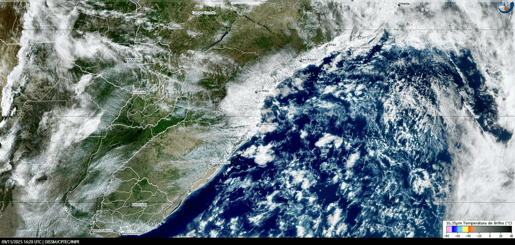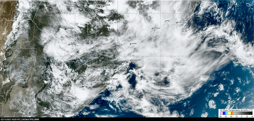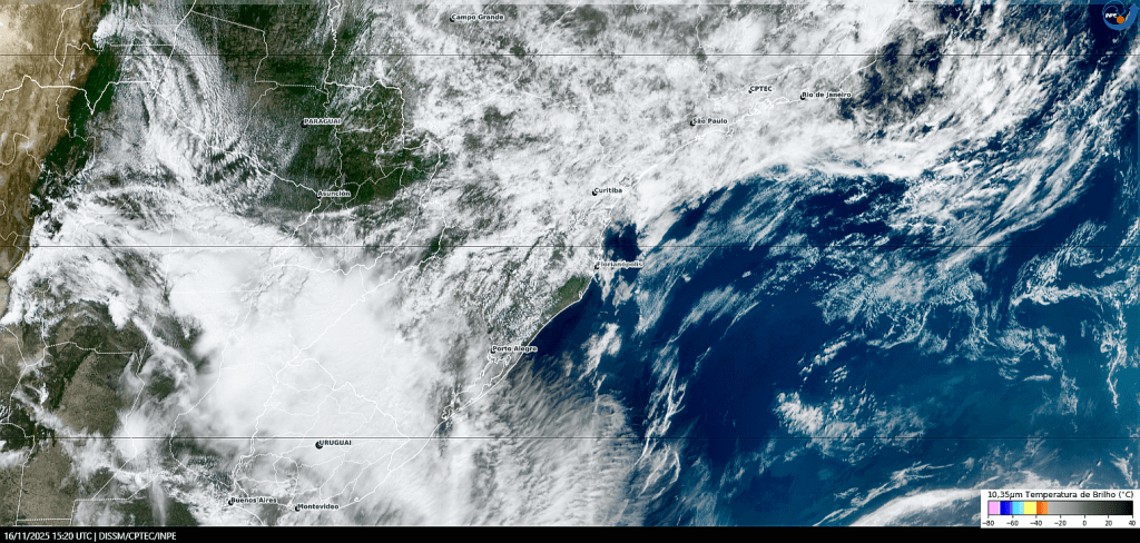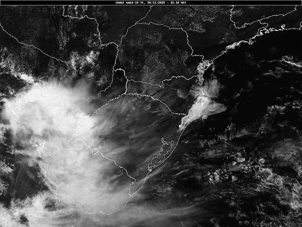 Imagem do satélite GOES 19/NOAA/EUA – Canal do visível – dia −30/11/2025 – Hora local: 12:10 – Sul do Brasil. Fonte: Instituto Nacional de Meteorologia (INMET) modificado por LabClima/UNIVALI.