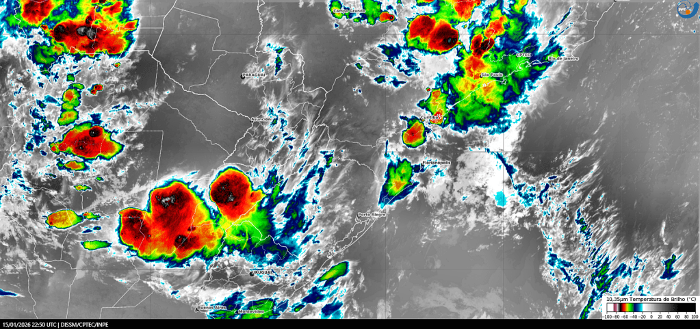 Imagem do satélite GOES 19/NOAA/EUA – Canal Infravermelho + IR 10,35 µm – dia – 15/01/2026 – Hora local: 19:50 – Sul do Brasil. Fonte: Instituto Nacional de Pesquisas Espaciais (INPE)/Centro de Previsão de Tempo e Estudos Climáticos (CPTEC)/Divisão de Satélites e Sistemas Ambientais (DAS) modificado por LabClima/UNIVALI. Clique para ampliar.