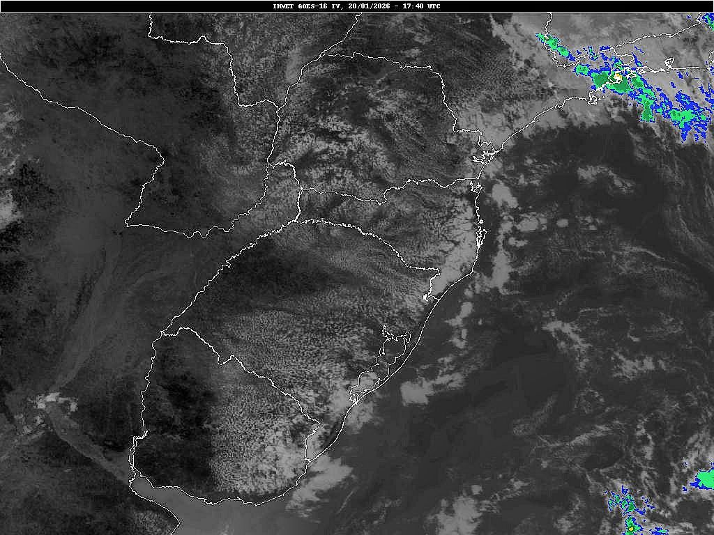 Imagem do satélite GOES 16/NOAA/EUA – Canal do Infravermelho + realce (topo das nuvens em °C) – dia – 20/01/0206 – Hora local: 15:40 – Sul do Brasil. Fonte: Instituto Nacional de Meteorologia (INMET) modificado por LabClima/UNIVALI.