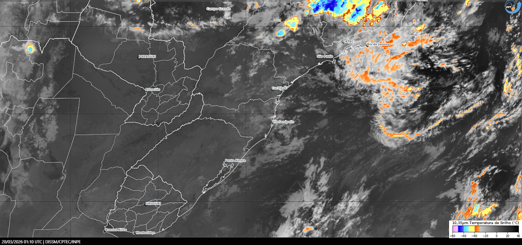 Imagem do satélite GOES 19/NOAA/EUA – Canal Infravermelho + IR 10,35 µm – dia – 19/03/2026 – Hora local: 22:10 – Sul do Brasil. Fonte: Instituto Nacional de Pesquisas Espaciais (INPE)/Centro de Previsão de Tempo e Estudos Climáticos (CPTEC)/Divisão de Satélites e Sistemas Ambientais (DAS) modificado por LabClima/UNIVALI. Clique para ampliar.