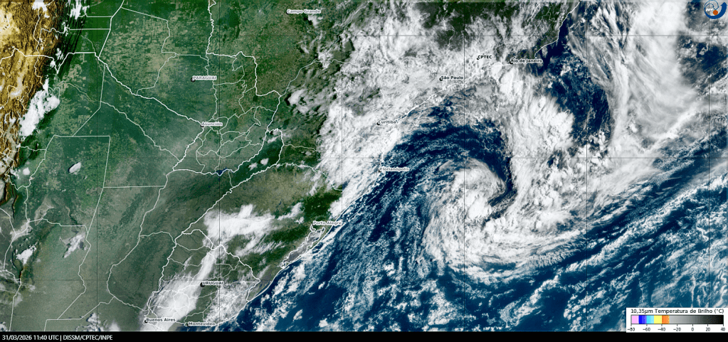 Imagem do satélite GOES 19/NOAA/EUA – Canal Infravermelho + IR 10,35 µm – dia – 31/03/2026 – Hora local: 08:30 – Sul do Brasil. Fonte: Instituto Nacional de Pesquisas Espaciais (INPE)/Centro de Previsão de Tempo e Estudos Climáticos (CPTEC)/Divisão de Satélites e Sistemas Ambientais (DAS) modificado por LabClima/UNIVALI. Clique para ampliar.