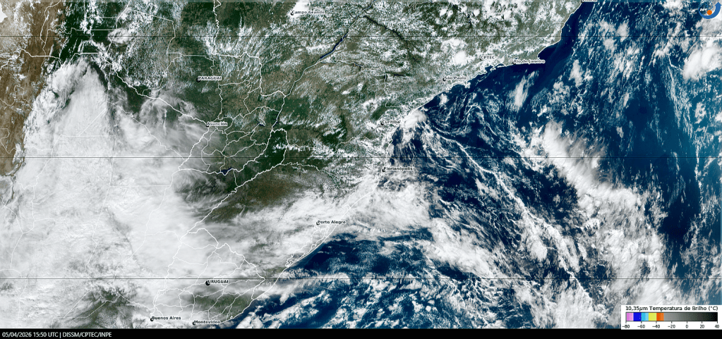 Imagem do satélite GOES-19/NOAA/EUA – Canal Infravermelho + IR 10,35 µm – dia – 05/04/2026 – Hora local: 12:50 – Sul do Brasil. Fonte: Instituto Nacional de Pesquisas Espaciais (INPE)/Centro de Previsão de Tempo e Estudos Climáticos (CPTEC)/Divisão de Satélites e Sistemas Ambientais (DAS), modificado por LabClima/UNIVALI. Clique para ampliar.