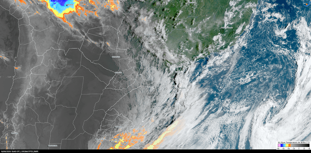 Imagem do satélite GOES-19/NOAA/EUA – True-Color + IR 10,35 µm – dia 16/04/2026 – Hora local: 07:40 – Sul do Brasil. Fonte: Instituto Nacional de Pesquisas Espaciais (INPE)/Centro de Previsão de Tempo e Estudos Climáticos (CPTEC)/Divisão de Satélites e Sistemas Ambientais (DAS), modificado por LabClima/UNIVALI. Clique para ampliar.