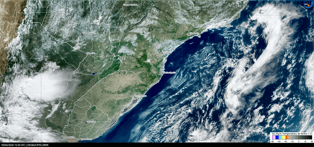 Imagem do satélite GOES-19/NOAA/EUA – True-Color + IR 10,35 µm – dia 19/04/2026 – Hora local: 12:30 – Sul do Brasil. Fonte: Instituto Nacional de Pesquisas Espaciais (INPE)/Centro de Previsão de Tempo e Estudos Climáticos (CPTEC)/Divisão de Satélites e Sistemas Ambientais (DAS), modificado por LabClima/UNIVALI. Clique para ampliar.