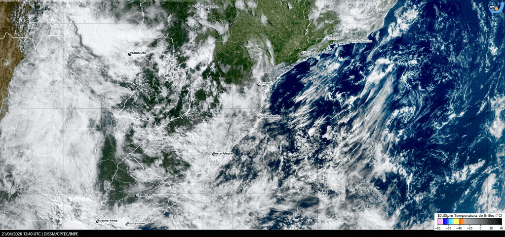 Imagem do satélite GOES-19/NOAA/EUA – True-Color + IR 10,35 µm – dia 21/04/2026 – Hora local: 10:40 – Sul do Brasil. Fonte: Instituto Nacional de Pesquisas Espaciais (INPE)/Centro de Previsão de Tempo e Estudos Climáticos (CPTEC)/Divisão de Satélites e Sistemas Ambientais (DAS), modificado por LabClima/UNIVALI. Clique para ampliar.