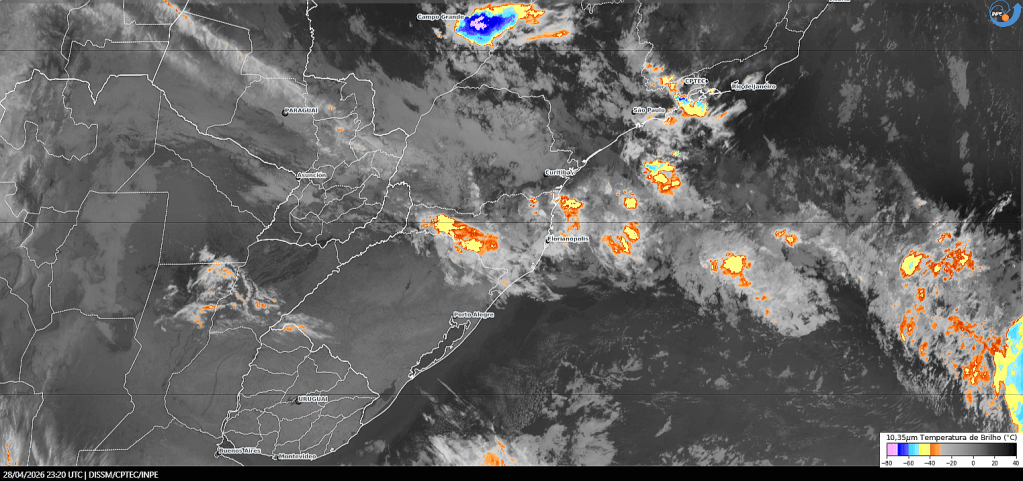 Imagem do satélite GOES-19/NOAA/EUA – Canal Infravermelho + IR 10,35 µm – dia 28/04/2026 – Hora local: 20:20 – Sul do Brasil. Fonte: Instituto Nacional de Pesquisas Espaciais (INPE)/Centro de Previsão de Tempo e Estudos Climáticos (CPTEC)/Divisão de Satélites e Sistemas Ambientais (DAS), modificado por LabClima/UNIVALI. Clique para ampliar.