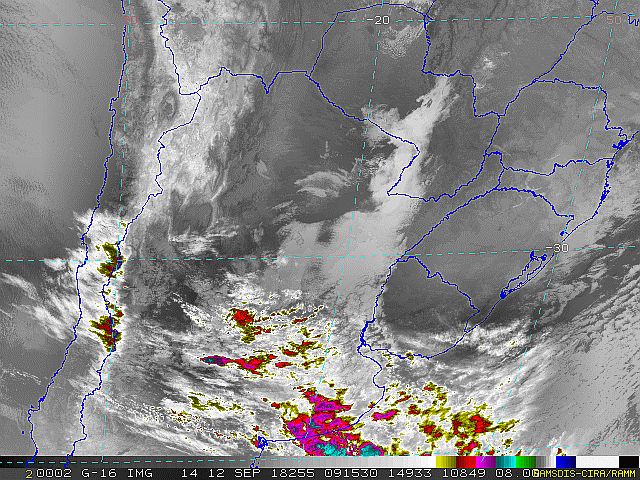 Imagem do satélite GOES 16/NOAA/EUA – Canal do Infravermelho + realce – dia – 13/09/2018 – Hora local: 06:45 – Sul do Brasil.  Fonte: RAMSDIS Online – Central and South America and the Caribbean, Cooperative Institute for Research in the Atmosphere, Colorado State University, EUA, modificado por LabClima/UNIVALI.