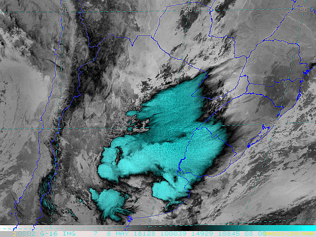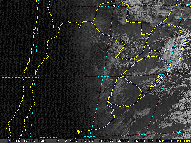 Estamos sob a influência de um anticiclone com seu núcleo sobre o oceano e sua maior variação na nebulosidade. Essa condição predominará no fim de semana. Na próxima terça-feira uma nova frente fria passará pelo estado e região trazendo chuva e ventos fortes. Observe a imagem de satélite dessa manhã nebulosidade concentrada sobre o planalto por causa da circulação marítima.