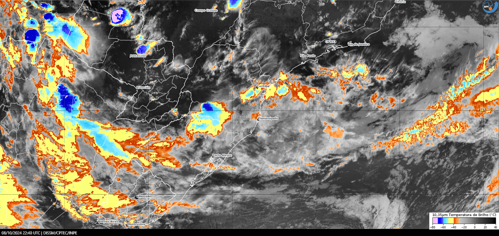 Imagem do satélite GOES 16/NOAA/EUA – Canal True-Color + IR 10,35 µm – dia – 08/10/2024 – Hora local: 19:40 – Sul do Brasil. Fonte: Instituto Nacional de Pesquisas Espaciais (INPE)/Centro de Previsão de Tempo e Estudos Climáticos (CPTEC)/Divisão de Satélites e Sistemas Ambientais (DAS) modificado por LabClima/UNIVALI. Clique para ampliar.
