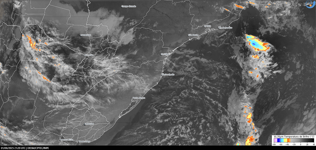 Imagem do satélite GOES 16/NOAA/EUA – Canal True-Color + IR 10,35 µm – dia – 01/06/2025 – Hora local: 18:20 – Sul do Brasil. Fonte: Instituto Nacional de Pesquisas Espaciais (INPE)/Centro de Previsão de Tempo e Estudos Climáticos (CPTEC)/Divisão de Satélites e Sistemas Ambientais (DAS) modificado por LabClima/UNIVALI. Clique para ampliar.
